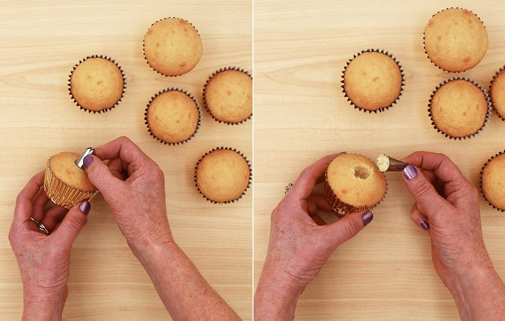Bake cupcakes in Foil Baking Cups according to package directions. When cool, use a metal tip from the Flowers & Borders Tip Set to remove a plug from the center of the cupcake.