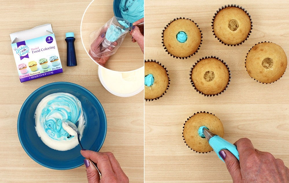 Fill the holes in the cupcakes using the blue or pink icing. Keep the icing even with the top of the cupcake.
