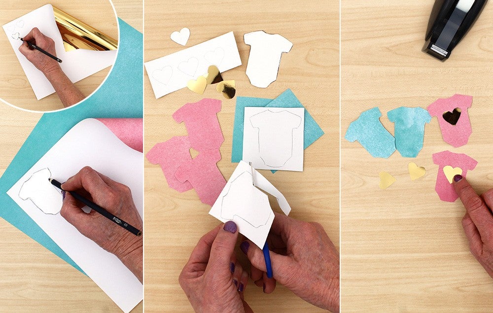 Use the templates provided to trace the onesies and hearts. The onesies get traced onto the back of the solid pink and blue Watercolor Designer Paper. The heart gets traced onto the back of the gold Foil Paper.