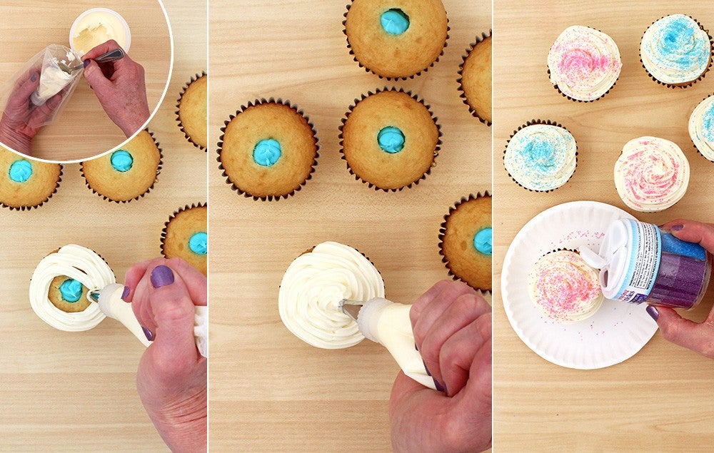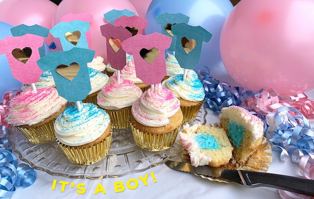 Is it a boy or a girl? Take a bite of these yummy cupcakes to reveal a pink or blue center.