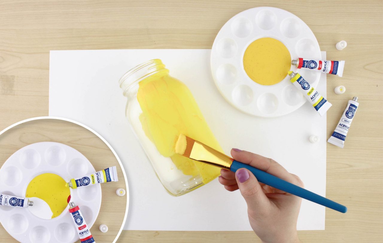 Mix together yellow, white, and a tiny amount red to get a slight orangey-yellow. Remember that red goes a long way so be sure to add the tiniest amount to start with, you can always add more later. Let dry.