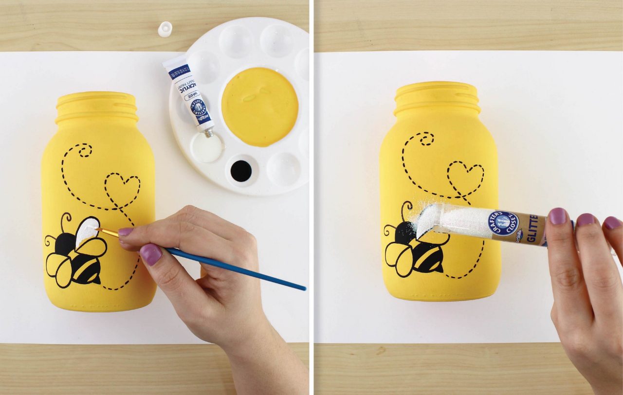 Take the black paint and a small brush. Fill in the appropriate areas of the bee, applying multiple coats as needed.