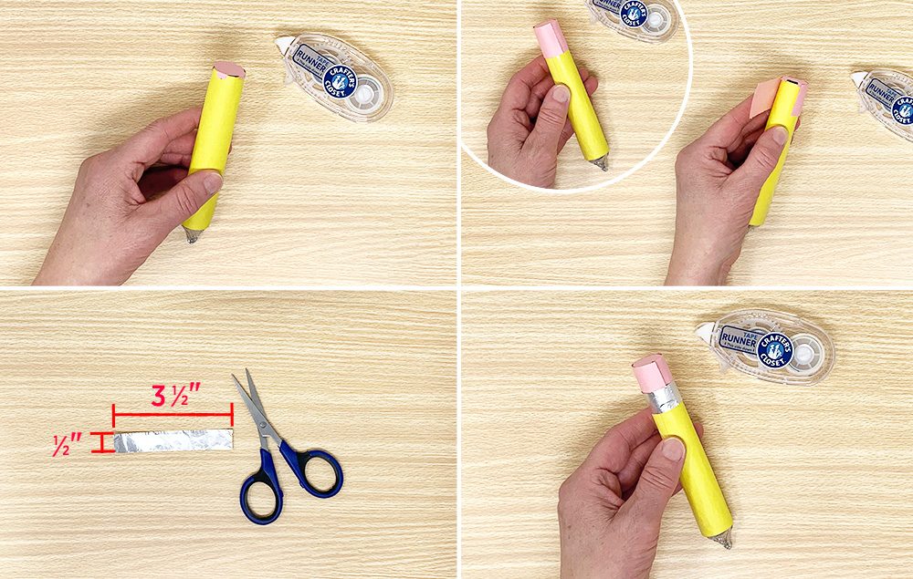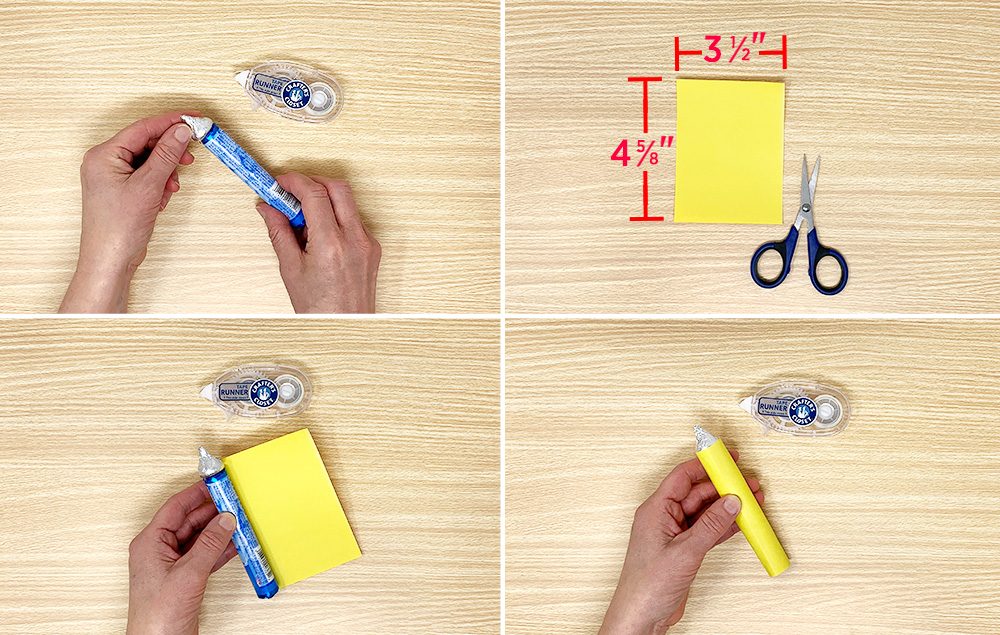 Apply adhesive with tape runner or double-sided tape to the remaining unattached edge of the construction paper. Wrap the yellow paper around the candy pencil, covering it completely.