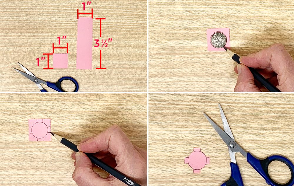 Measure and cut a 1"x1" square of pink construction paper and a 1" x 3 1/2" rectangle of pink construction paper.