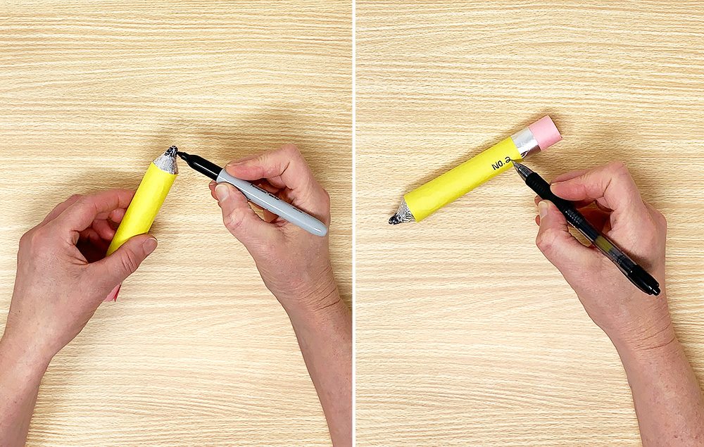 Write “No. 2” on the side of the pencil near the foil edge.