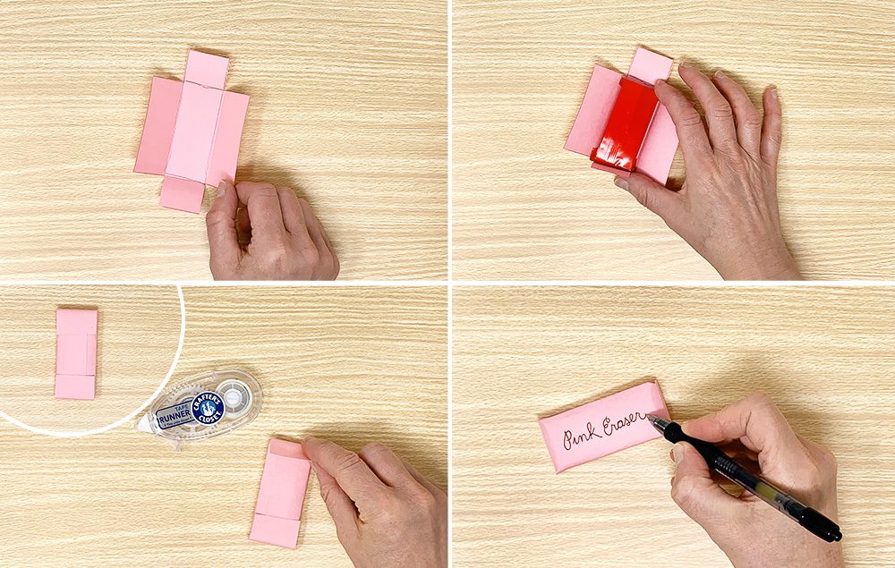 Flip candy eraser over and write “Pink Eraser” on the front. Tip: use cursive letters to give it some extra flare.