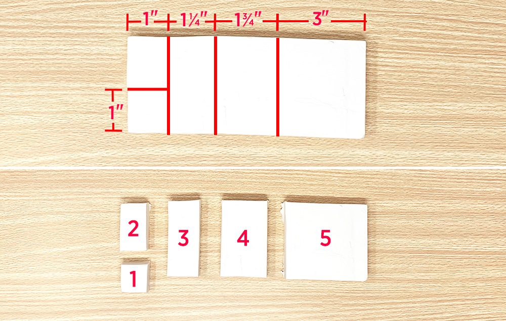 Place rectangle block of clay horizontally on a cutting surface. Measure and cut strips from the clay block. Measuring across the top of the rectangle: 1", 1 1/4", 1 3/4", and 3". Cut a 1" x 1" cube from the end of the 1" strip.