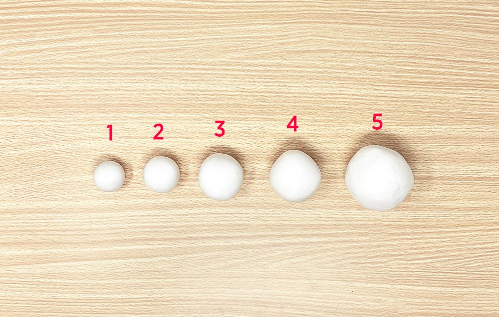 Roll the clay strips into 5 balls. The clay balls should gradually go up in size.